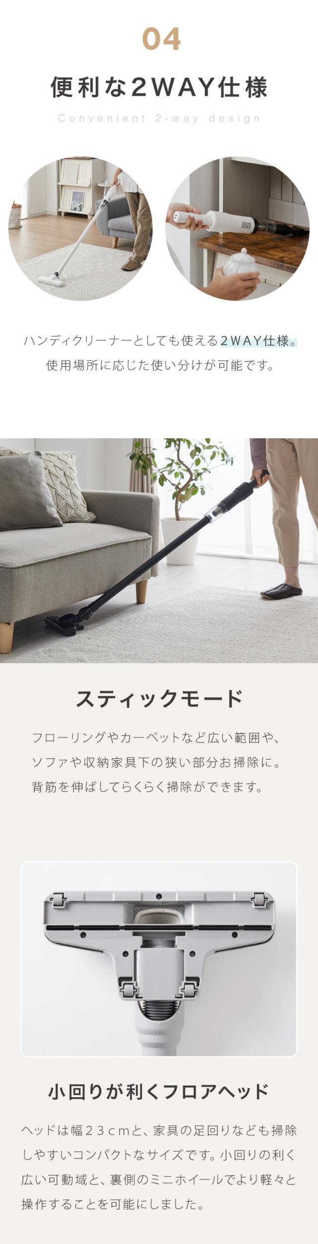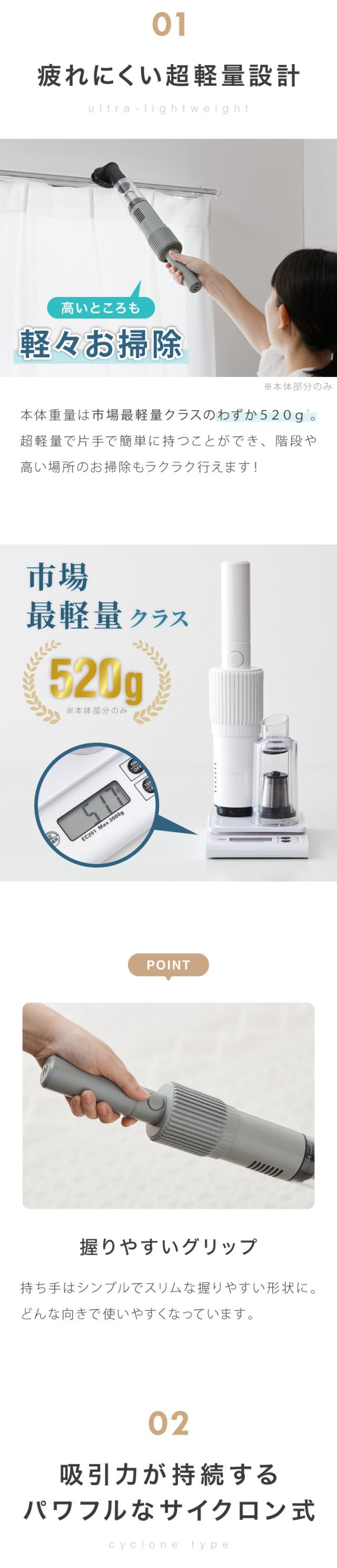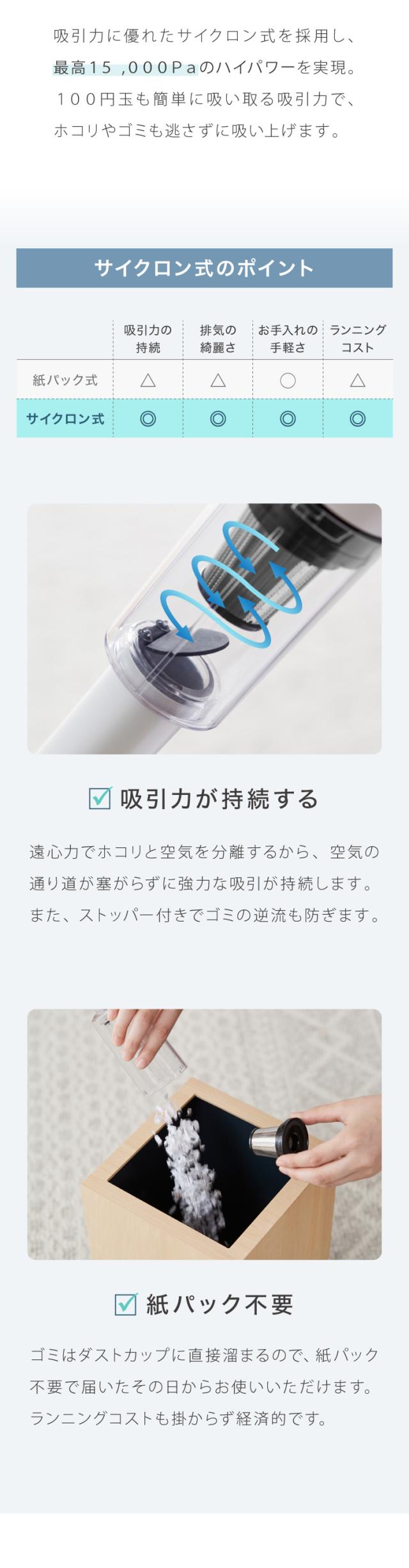 高回転&高耐久のDCモーターを採用し、吸引力と持続性を両立。しっかり掃除したい方にぴったりです。
