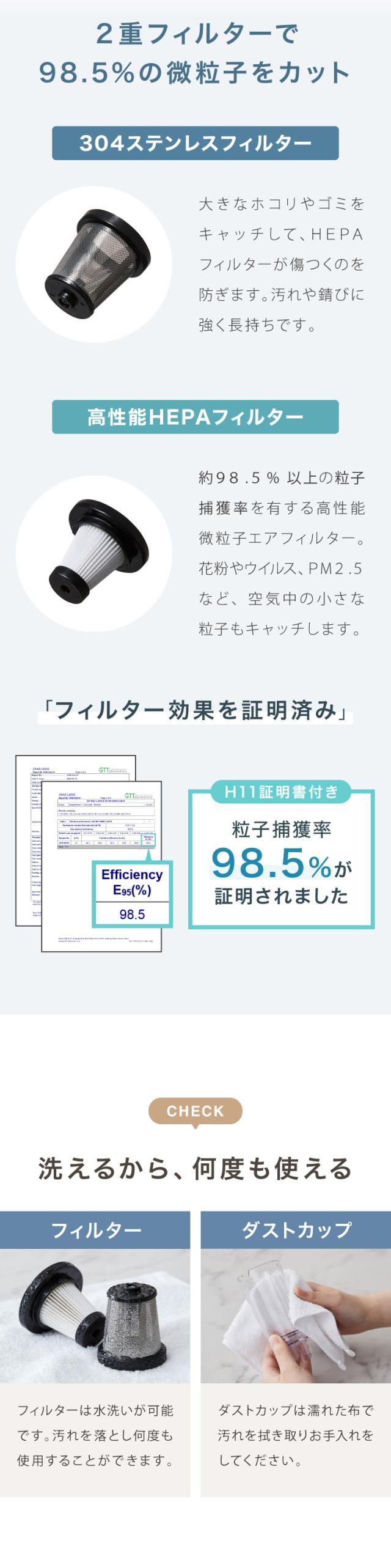 サイクロン分離技術とH11等級HEPAフィルター(捕集率98.5%)で、微細なハウスダストや花粉もしっかりキャッチ。