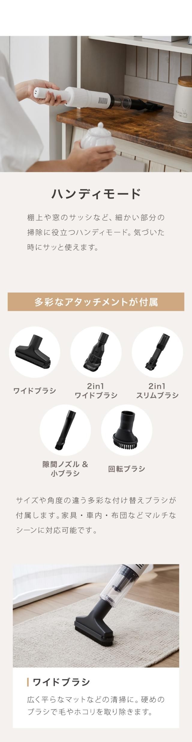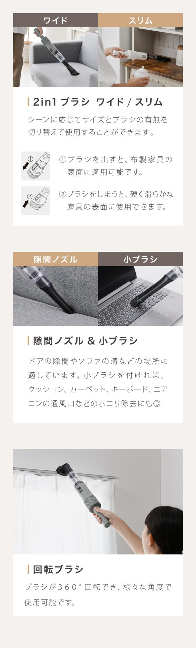 付属品:隙間ノズル&小ブラシ、ワイドブラシ、2in1ワイドブラシ、2in1スリムブラシ、回転ブラシ、USB充電ケーブル、取扱説明書