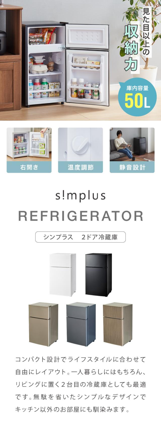 冷蔵庫 2ドア 50L simplus コンパクト セカンド冷蔵庫 冷凍冷蔵庫 コンパクト 一人暮らし オフィス 右開き SP-50LD2 【メーカー保証1年】