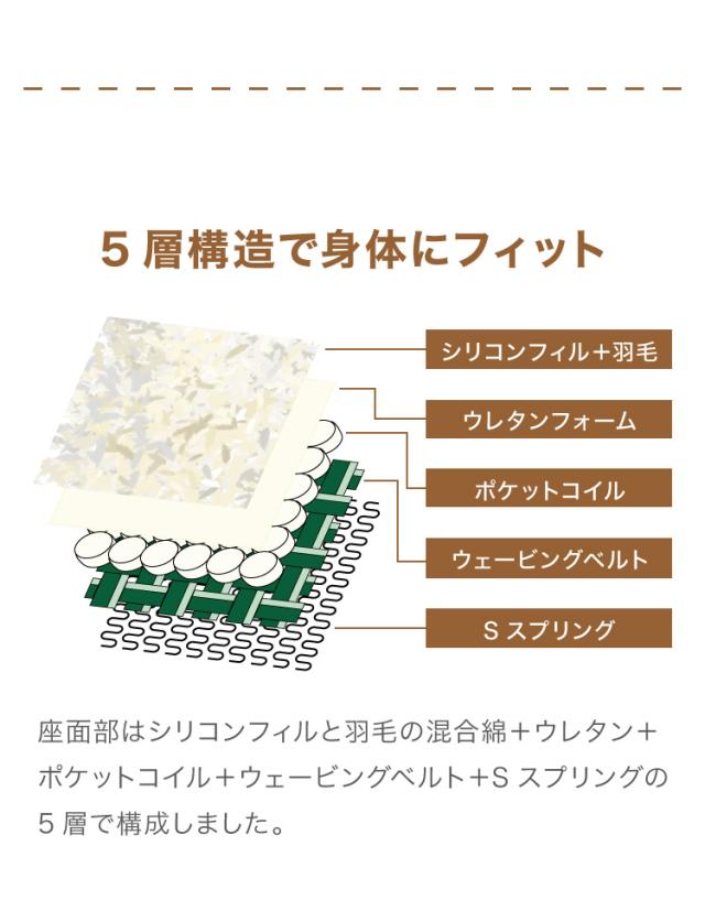 クッション材(座面):鋼製バネ/ウェービングベルト/ウレタンフォーム/ポケットコイル/鋼/シリコンフィル/フェザー(羽毛)