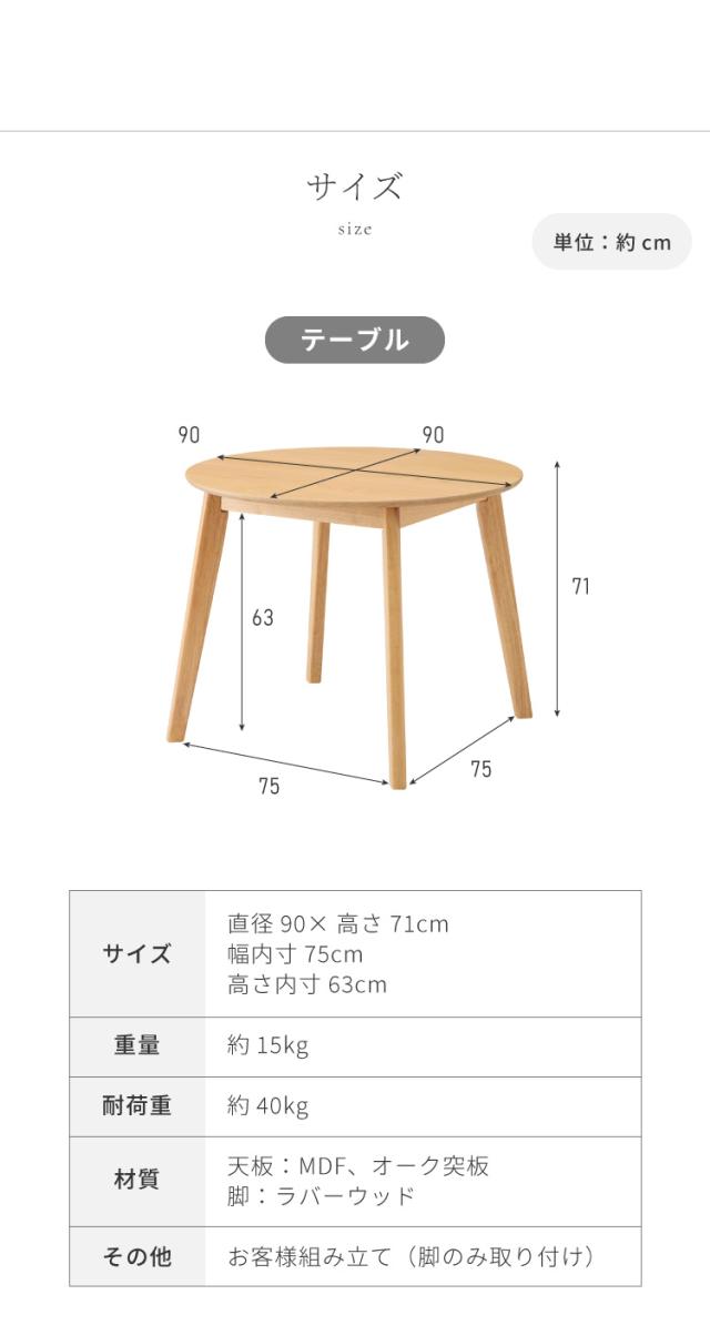 ・直径90cmとダイニングチェア「セナ」の3点セットです。