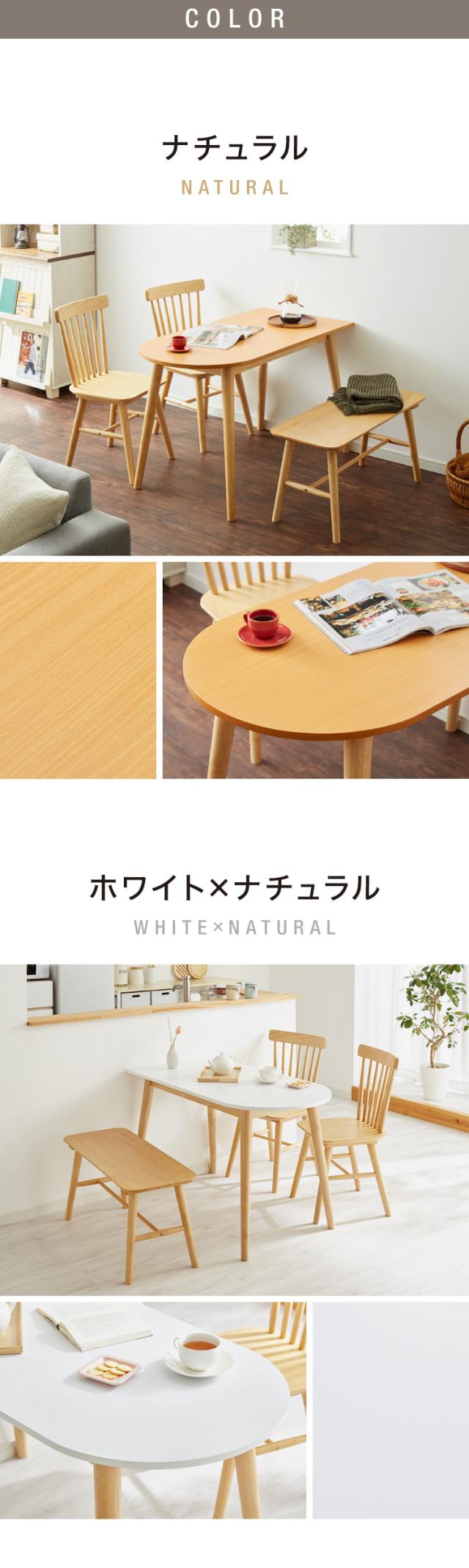 ・丸形と長方形を合わせたダイニングテーブルとウィンザーチェア、ベンチの4点セットです。