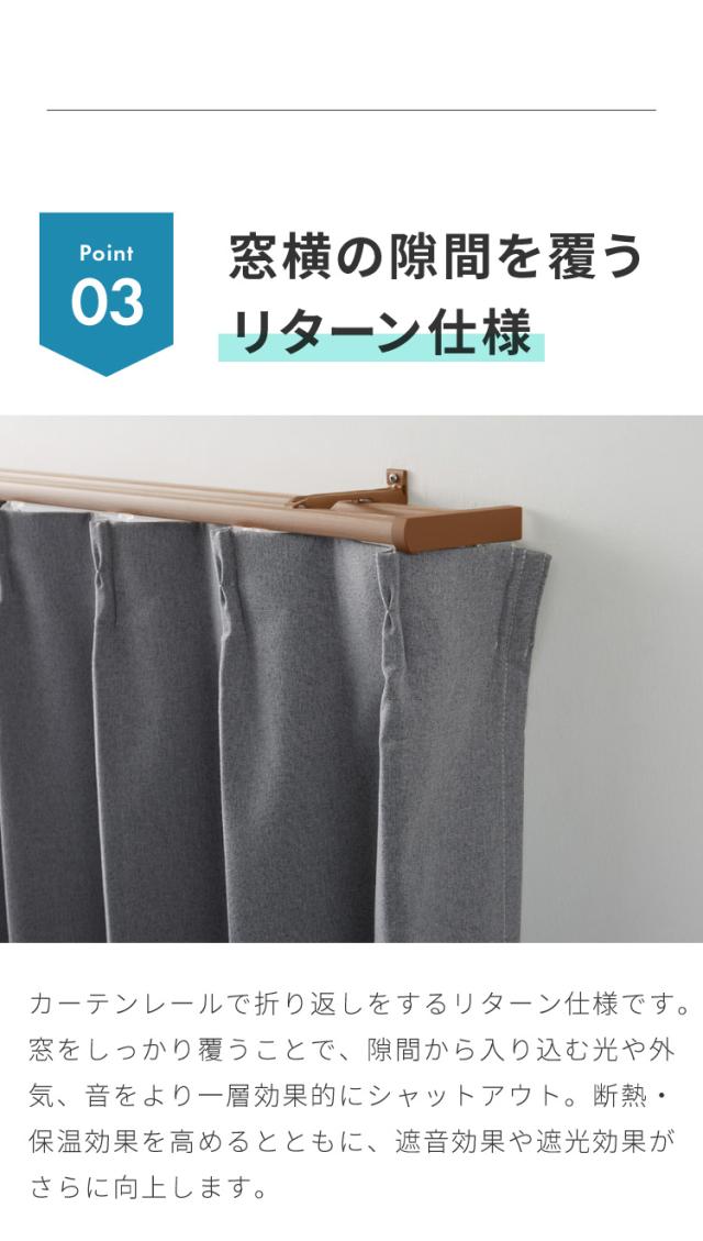 本製品はカーテンレールで折り返しをするリターン仕様なので断熱・保温効果を高めるとともに遮音効果も遮光効果が更に向上します。