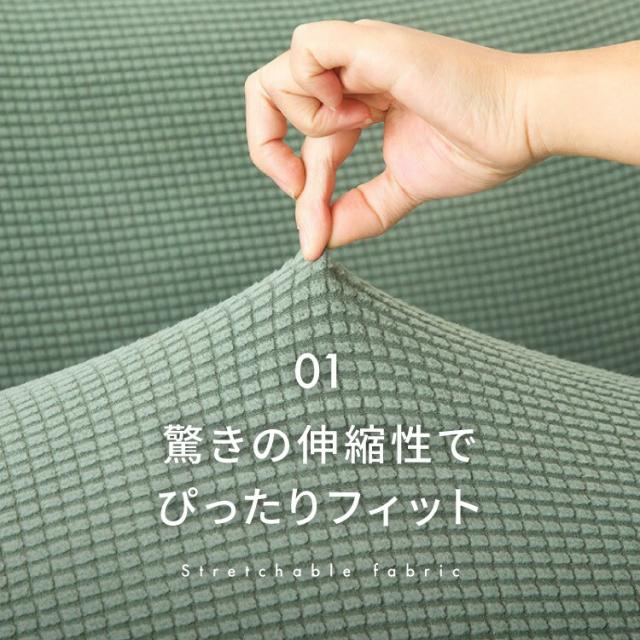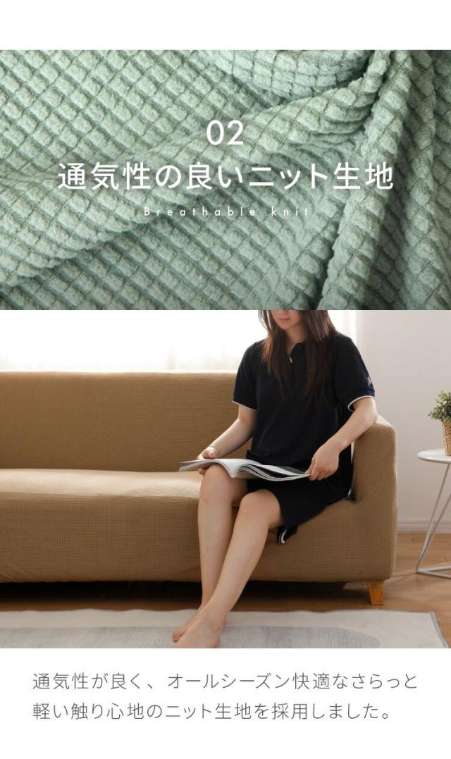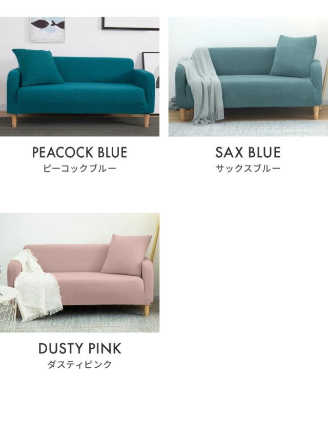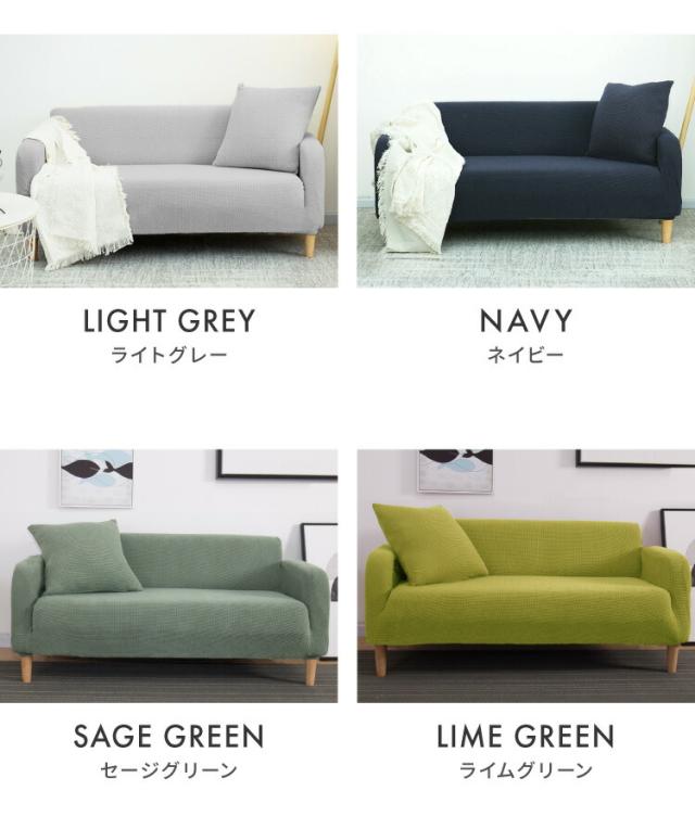 ソファカバー、ソファーカバー、2人掛、3人掛、肘あり、ストレッチニット生地、伸縮素材、ぴったり、フィット、洗濯可能、固定紐付き、おしゃれ、韓国、くすみカラー、アイボリー、キャメル、ココアブラウン、ライトグレー、グレー、ライムグリーン、サックスブルー、セージグリーン、ピーコックブルー、ネイビー、ダスティピンク