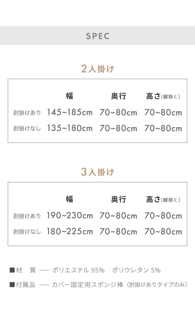3人掛け 約幅180-225cm 奥行き70〜80cm 高さ(脚除く)70〜80cm