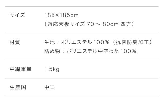 幅185×奥行185cm(推奨天板サイズ70〜80cm四方)