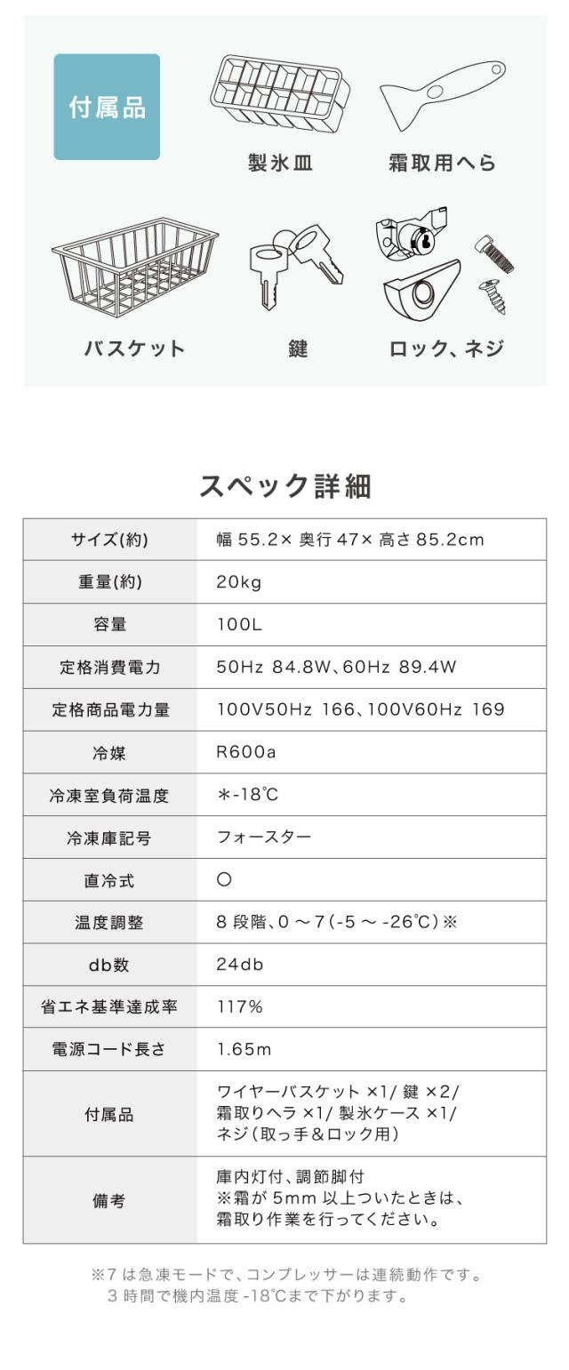 付属品:ワイヤーバスケット×1/鍵×2/霜取りヘラ×1/製氷ケース×1/ネジ(取っ手&ロック用)