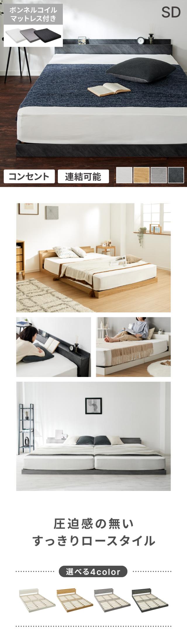 連結金具付き フロアベッド ローベッド セミダブル ボンネルコイルマットレス ベッド ベッドフレーム 2口コンセント付き 連結ベッド すのこベッド 宮棚 ロータイプベッド マットレス付き 一人暮らし(代引不可)【送料無料】