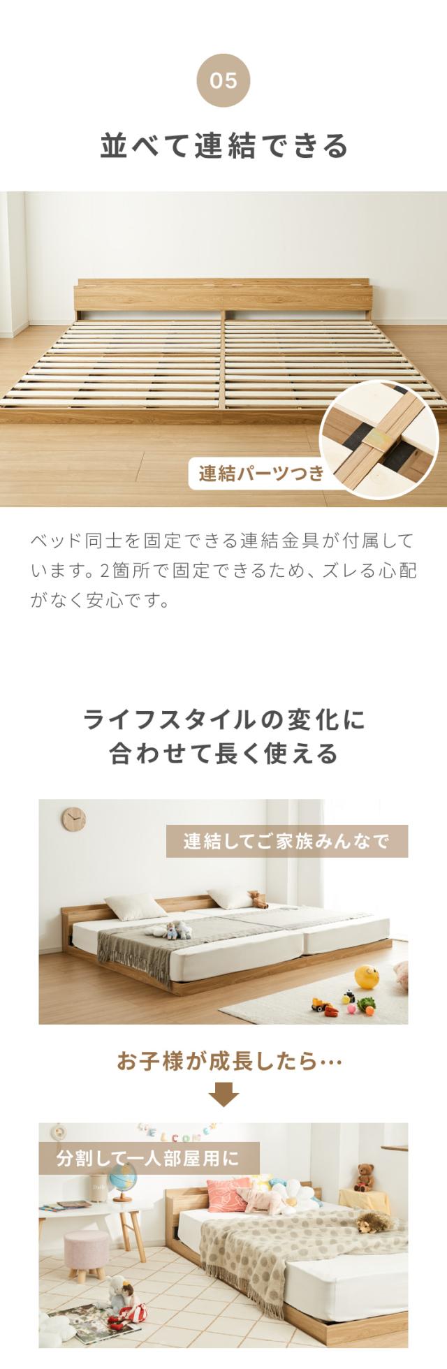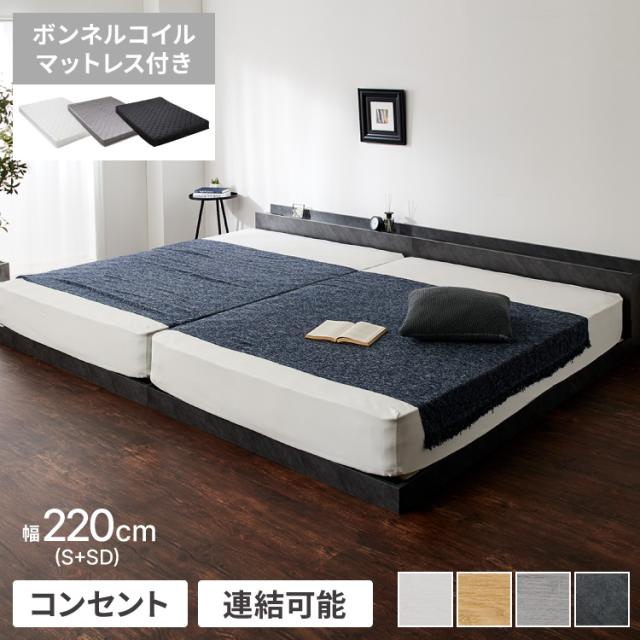 ファミリーベッド ローベッド ワイドキング220(S+SD)ボンネルコイルマットレス ベッド ベッドフレーム 2口コンセント付き 連結ベッド すのこベッド 宮棚 フロアベッド マットレス付き(代引不可)【送料無料】