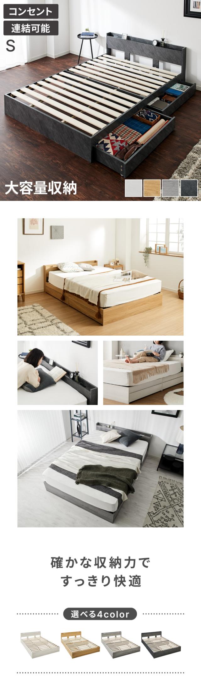 連結金具付き 収納ベッド シングル ベッド 収納付き ベッドフレーム 2口コンセント付き 連結ベッド すのこベッド 宮棚 引き出し付きベッド フレーム単品 一人暮らし ファミリーベッド【送料無料】