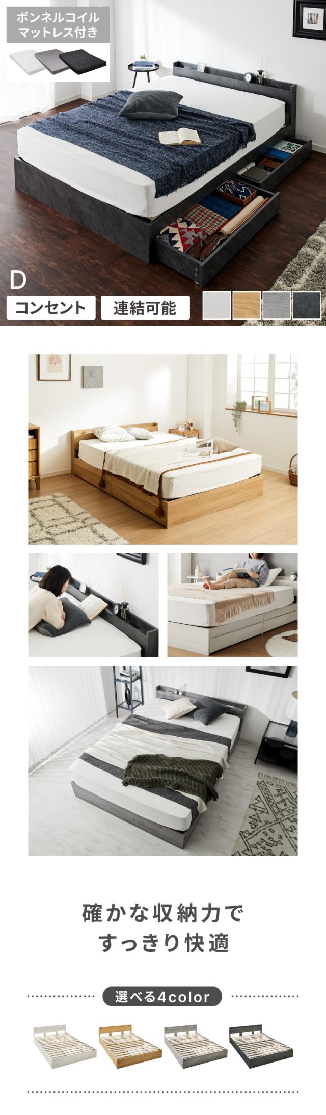 連結金具付き 収納ベッド ダブル ボンネルコイルマットレス付き ベッド 収納付き ベッドフレーム 2口コンセント付き 連結ベッド すのこベッド 宮棚 引き出し付き 一人暮らし マットレス付き(代引不可)【送料無料】