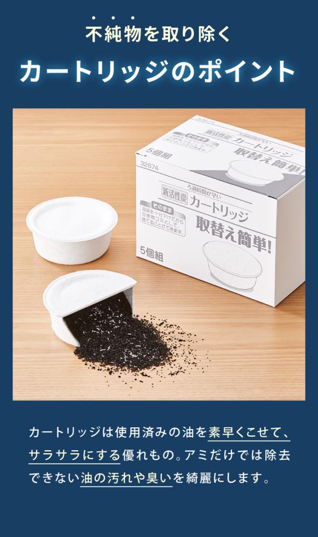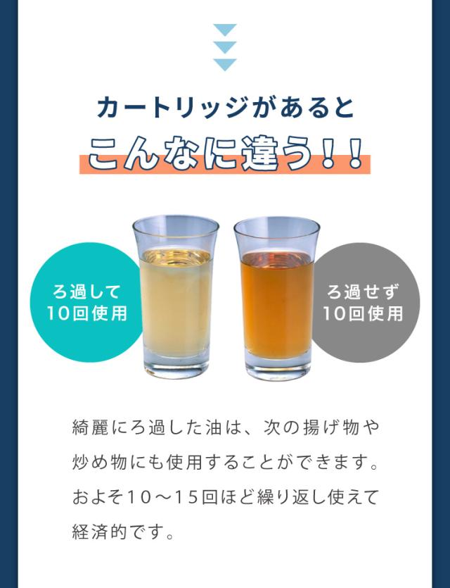 カートリッジは使用済みの油を素早くこせて、サラサラにする優れもの。
