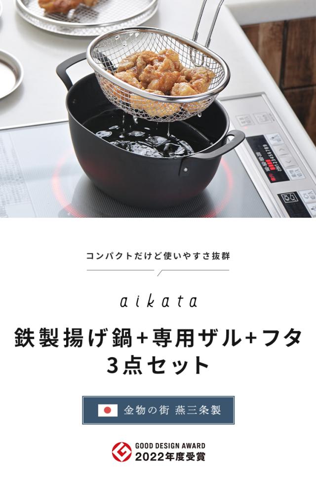 ヨシカワ aikata 鉄製揚げ鍋+専用ザル+フタ 3点セット 日本製 燕三条 ガス火 IH対応 楕円 オーバル 天ぷら鍋 揚げ鍋 ざる ザル フタ 蓋 フライヤー バスケット アイカタ Yoshikawa【送料無料】