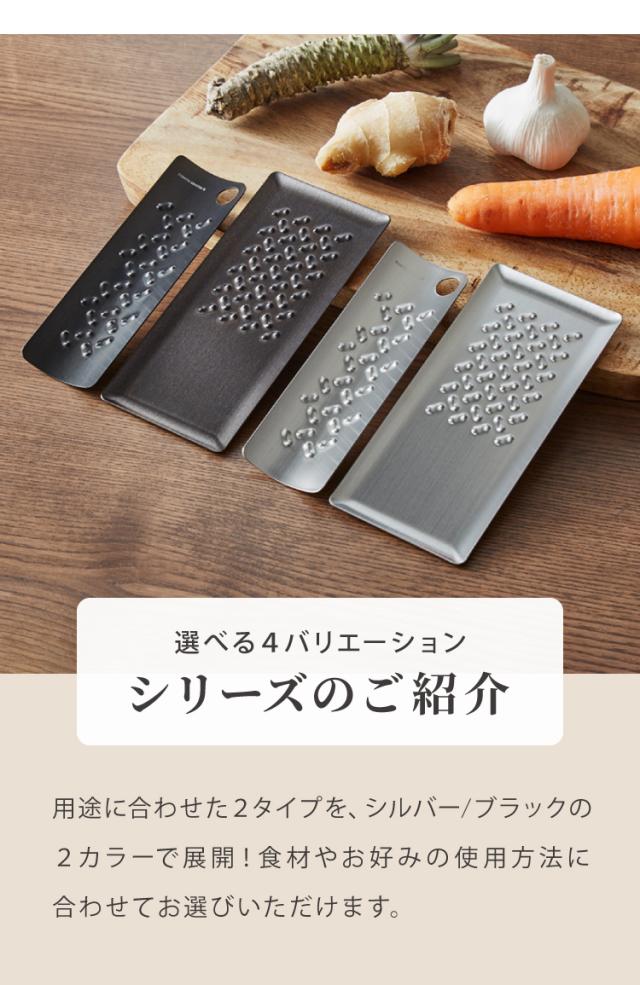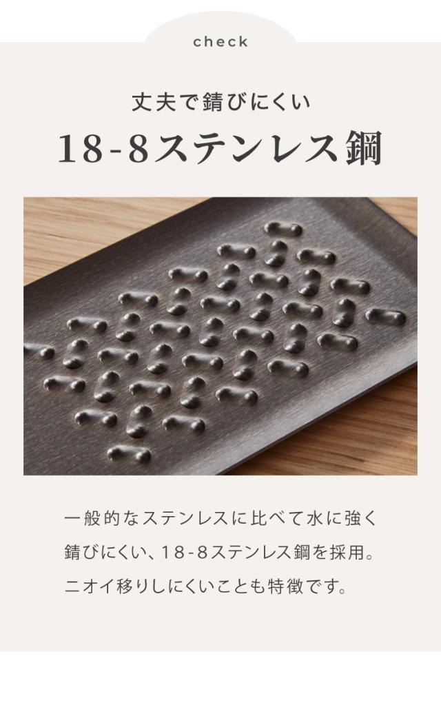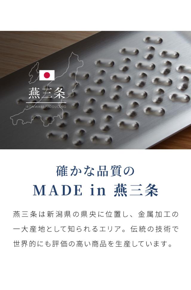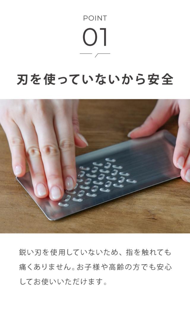 燕三条発!刃を使わないおろし金はすりおろしのときに手を切らず安心、安全。にんにくなど小さな食材も最後まで擦り切れる!洗う時のスポンジも引っかからずお手入れ簡単♪