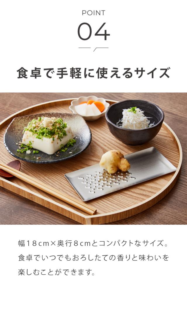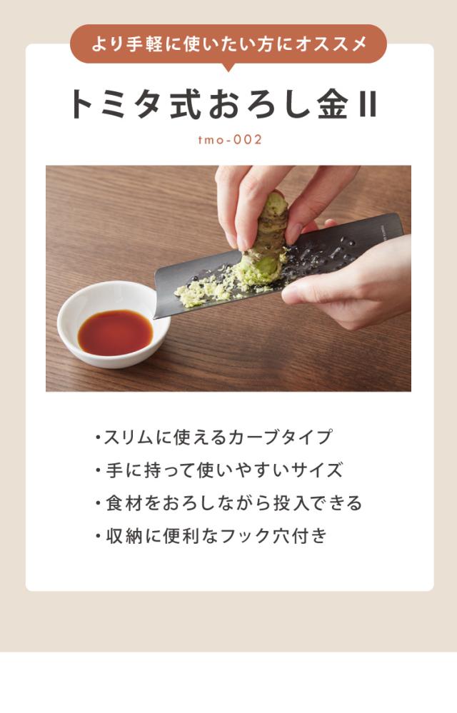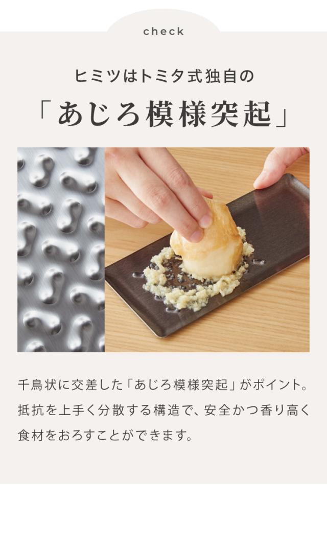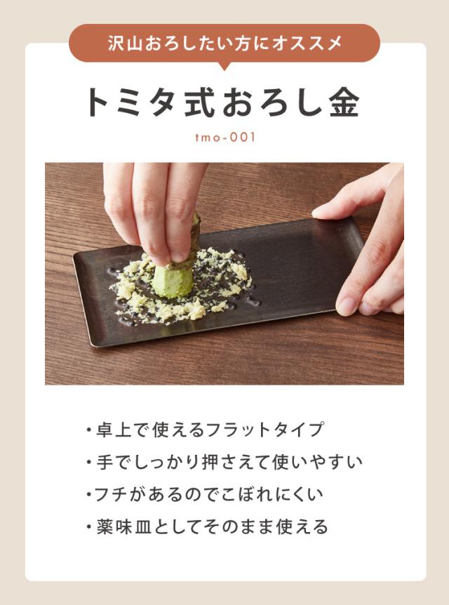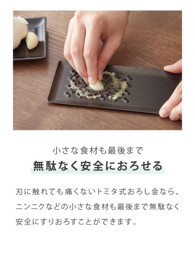 50年以上の歴史を持つ金属加工会社トミタが作る、刃を使わない「トミタ式おろし金」。刃がないからすりおろしのときに手を切らず安心、安全。にんにくなど小さな食材も最後まで擦り切れて、目詰まりをとるスクレーパーも必要ありません。洗う時のスポンジも引っかからずお手入れ簡単