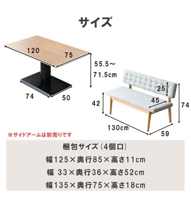 4点セット/テーブル+ベンチ2脚+サイドアーム