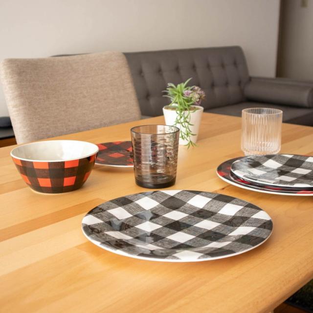 落ち着いた赤いチェック柄が素敵な質感のあるメラミン食器です