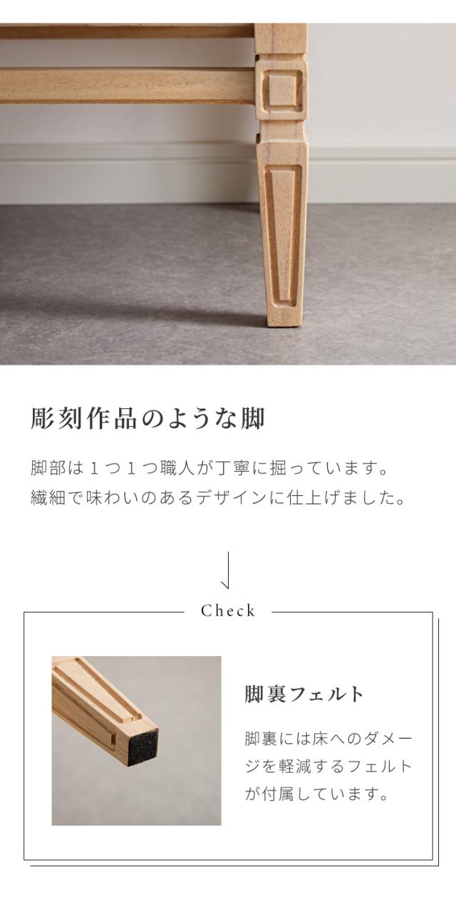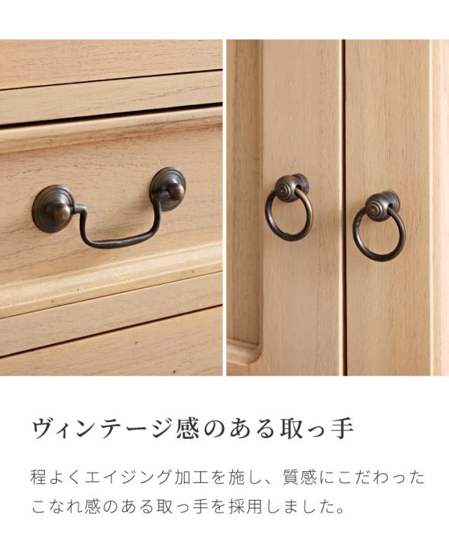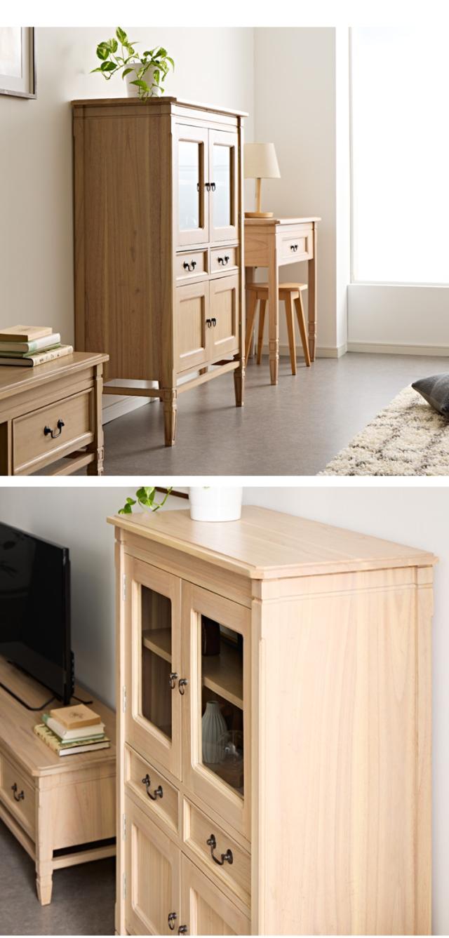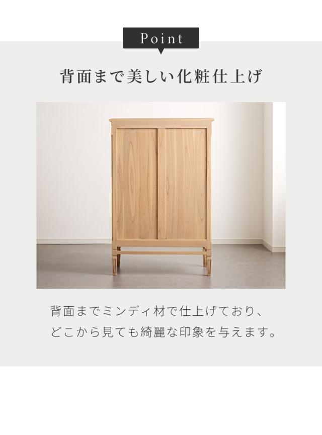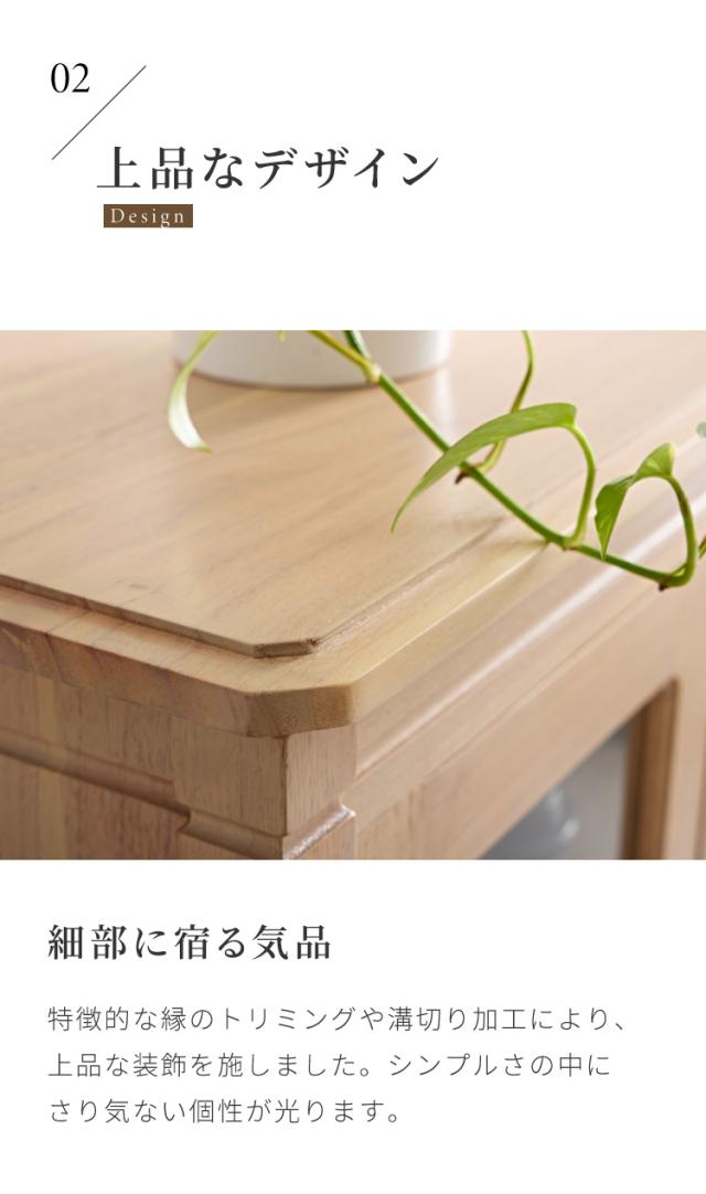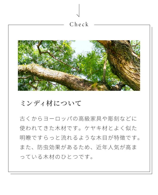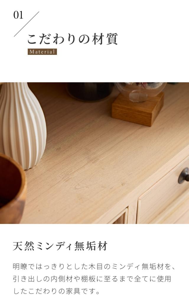 ・引き出しの内側材や、商品背面、棚付き商品は棚板等、通常だと合板を使用するような部分も全てミンディ無垢材を使用しています。
