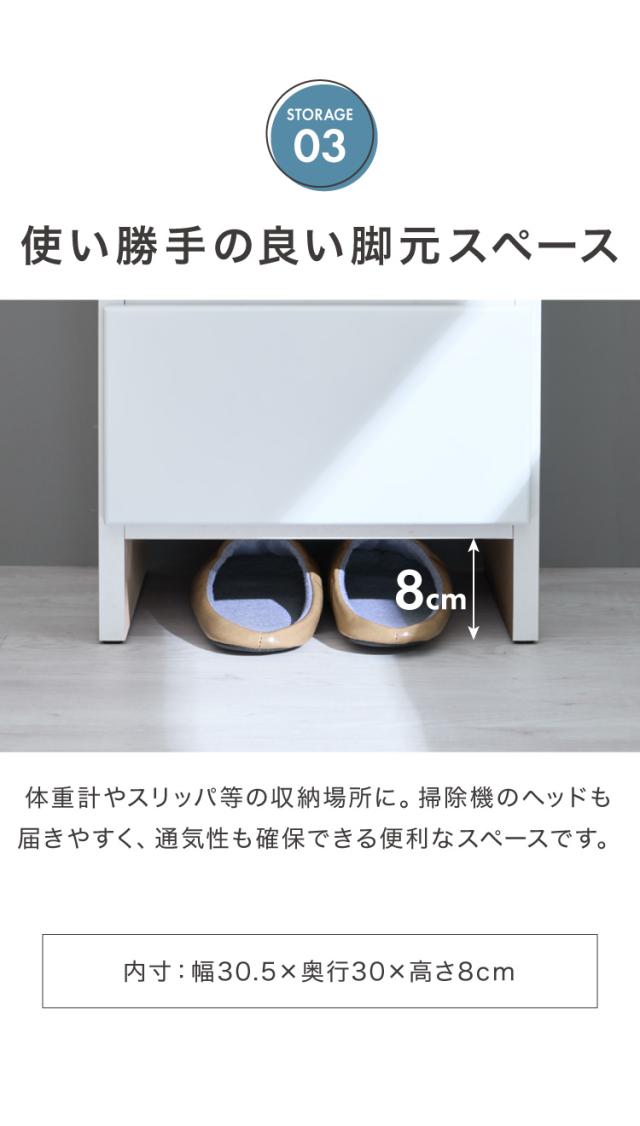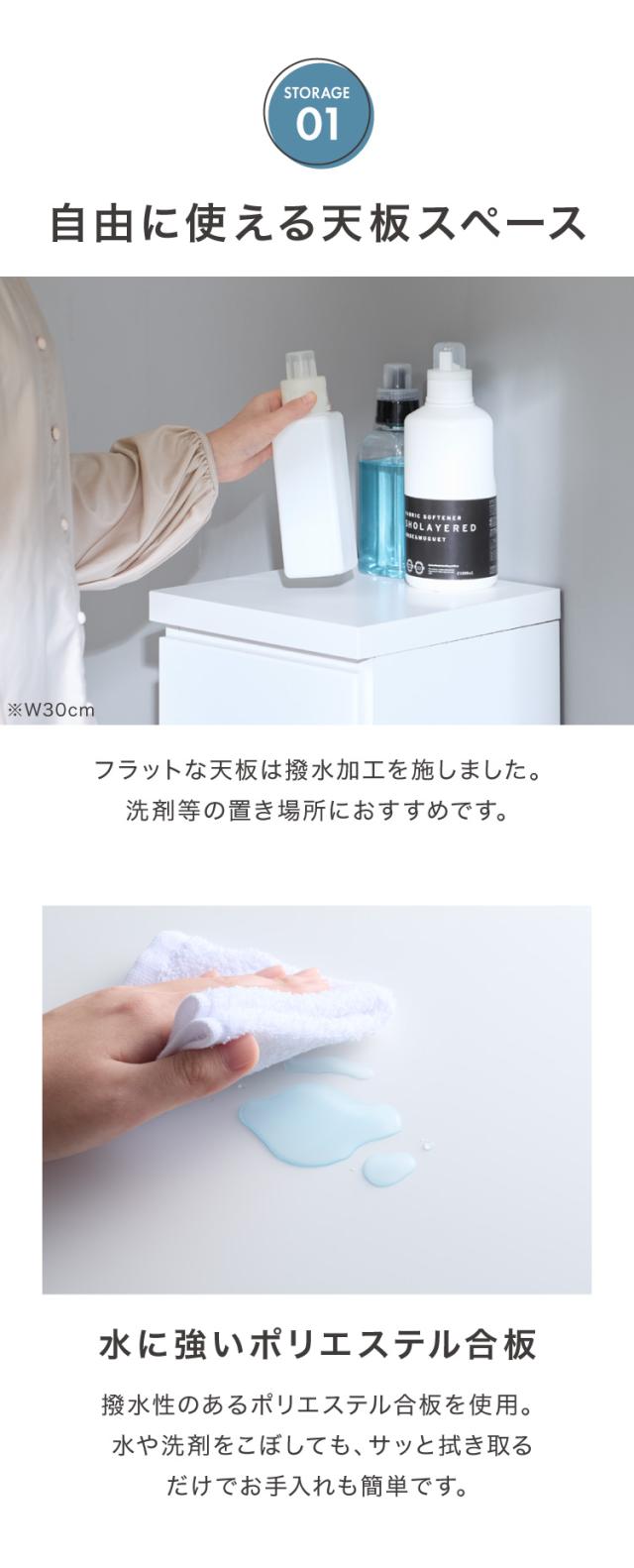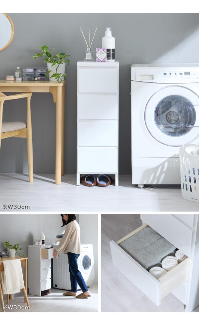 ・脱衣所や廊下など狭い空間で活躍する薄型ロータイプのランドリー収納です。