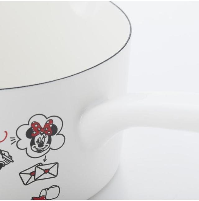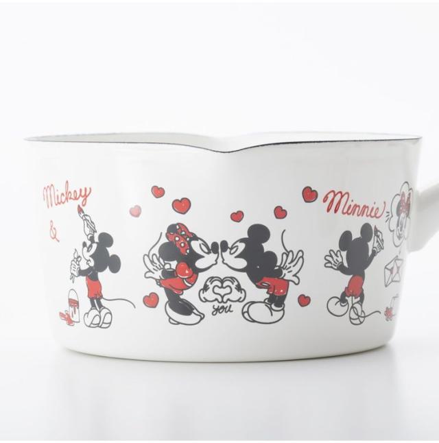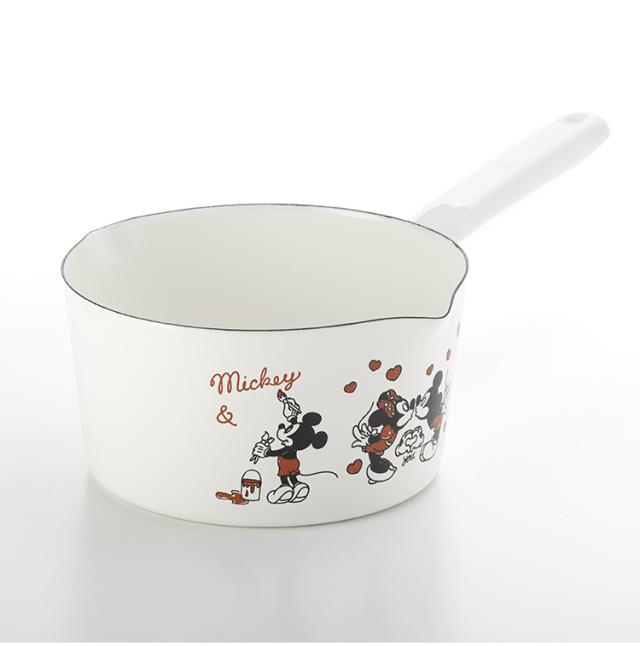 コミカルでラブラブなミッキーとミニー!ラブラブなミッキーとミニーがコミカルなタッチで描かれた「Shake hands」シリーズ。ハートがたくさんでとってもキュートです。両側注ぎ口付きで利き手を気にせず注げます。2〜3人用の大きさです。ミルクの温め、レトルト食品の温めなどに!表面はガラス質のため、金属が溶出せず食材の味を変えないことから、ジャム作りや離乳食の調理に適しています。新潟県燕市でホーローの美しい表面にひとつひとつ絵柄を丁寧に手で貼り、仕上げているホーローです。ホーロー(琺瑯)は鉄などの金属の表面にガラス質の釉薬を高温で焼きつけたものです。ホーローは耐酸性に優れており、酸・塩分に強く、においや汚れもつきにくい性質があります。また色が移らず、雑菌が繁殖しにくいので衛生的にお使いいただけます。