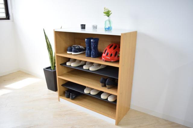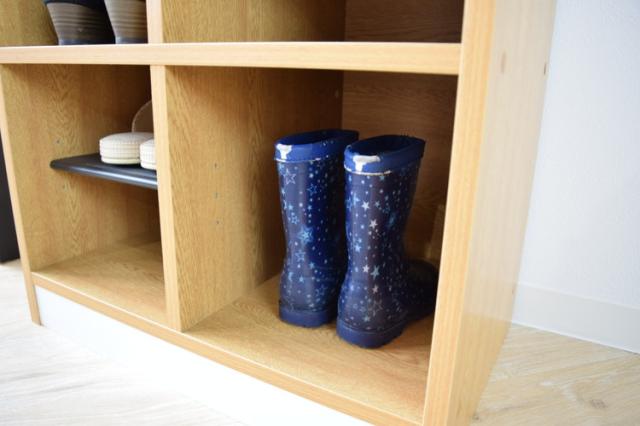 中棚を取り外せばお洒落な木目の収納棚として使用することができ、ショートブーツやお子さまの長靴など高さのあるものも収納することができます。