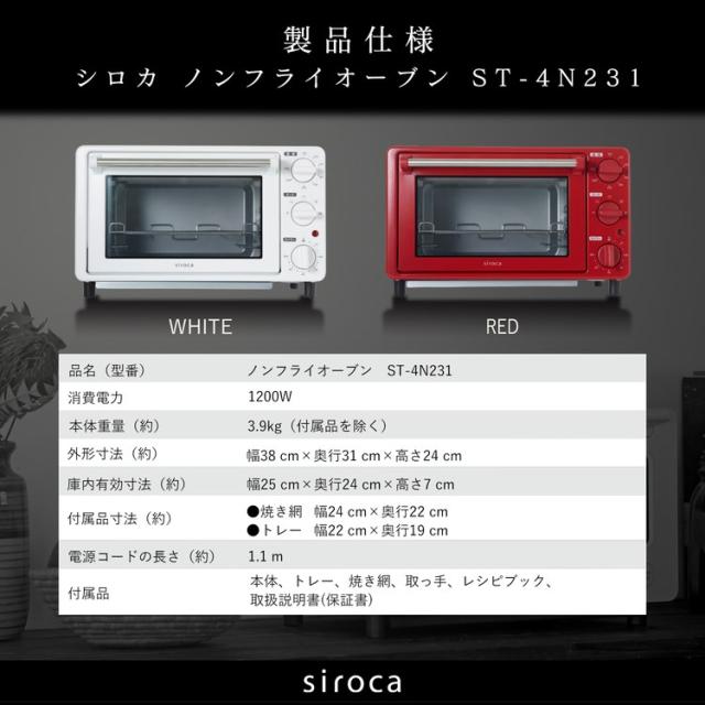siroca シロカ ノンフライオーブン オーブントースター 4枚焼き パンくずトレー タイマー最大60分 オーブン調理 ノンフライ調理 コンベクション コンパクト レシピ付 ST-4N231 ホワイト レッド【送料無料】