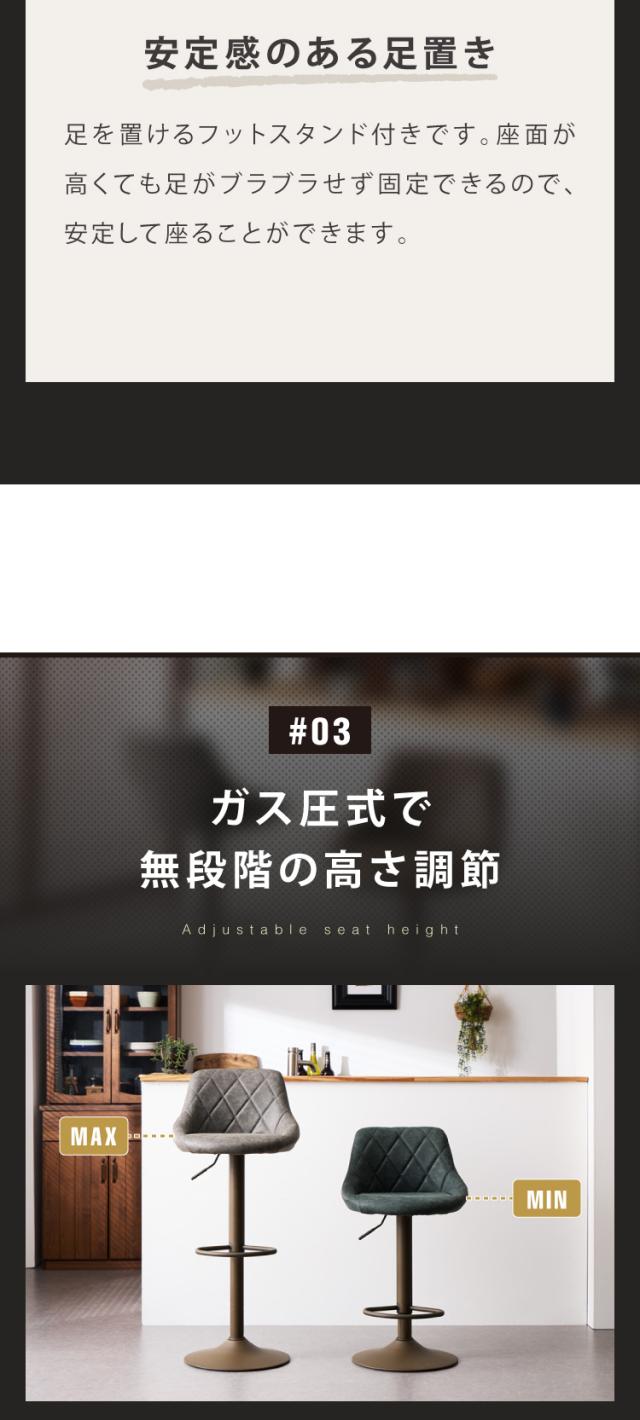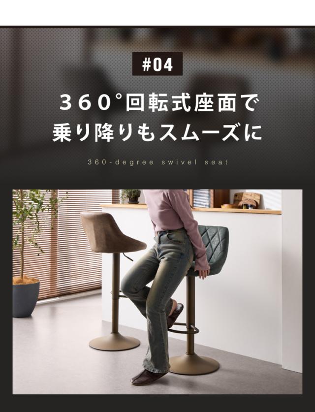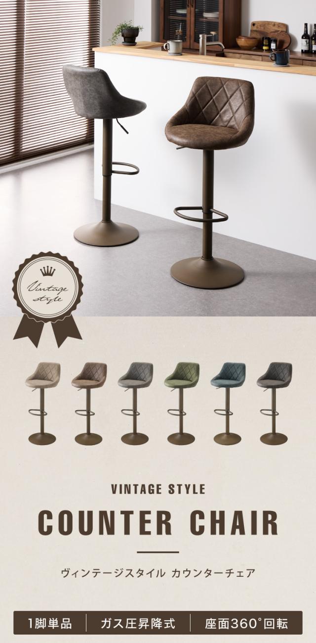 カウンターチェア、ガス圧、回転式、昇降式、ガス圧昇降、背もたれ付き、レザー、ヴィンテージ、PUレザー