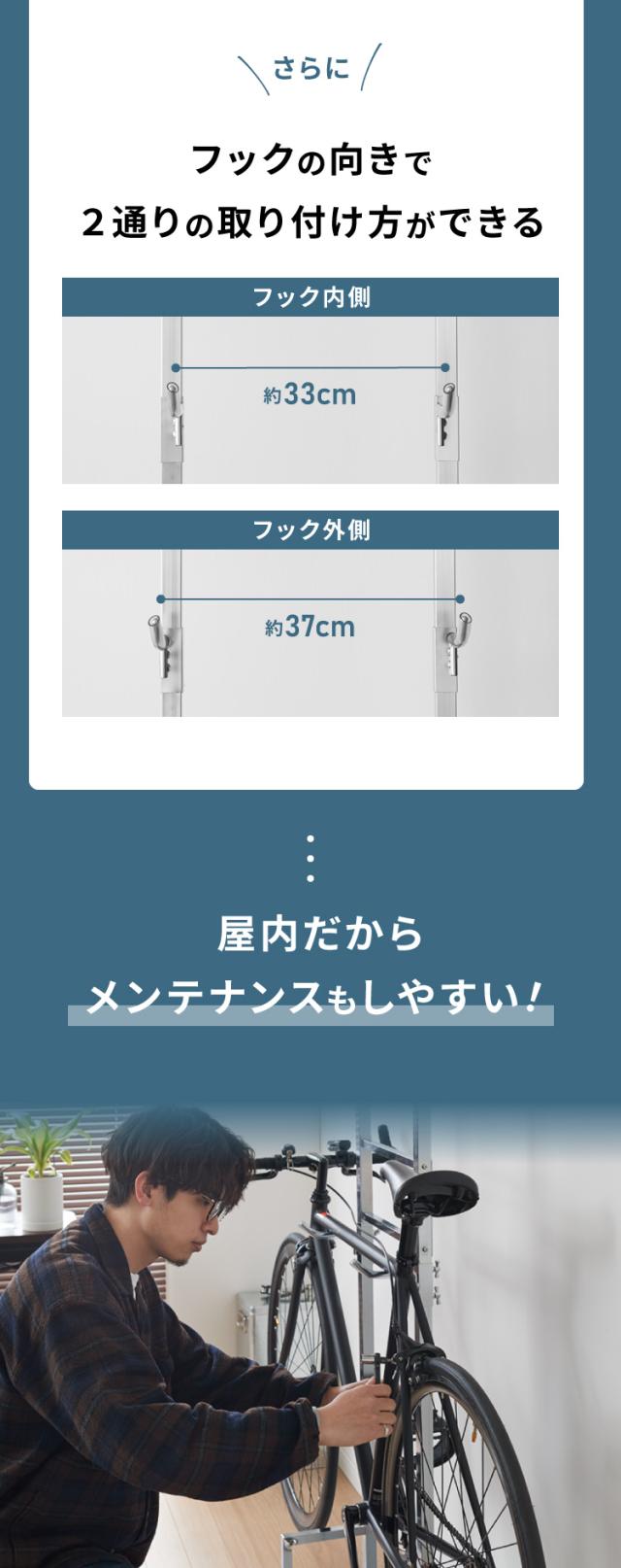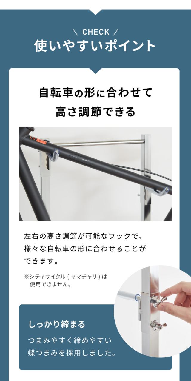 左右の高さ調節が可能なフックで、様々な自転車に使えます。