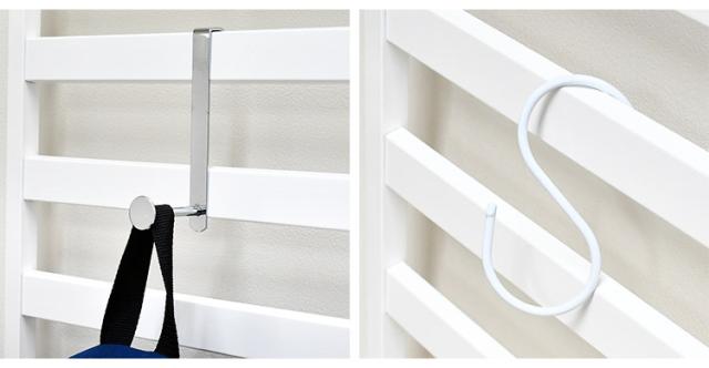 2種類の付属フックに服やカバン等を引っ掛けて収納することができます。