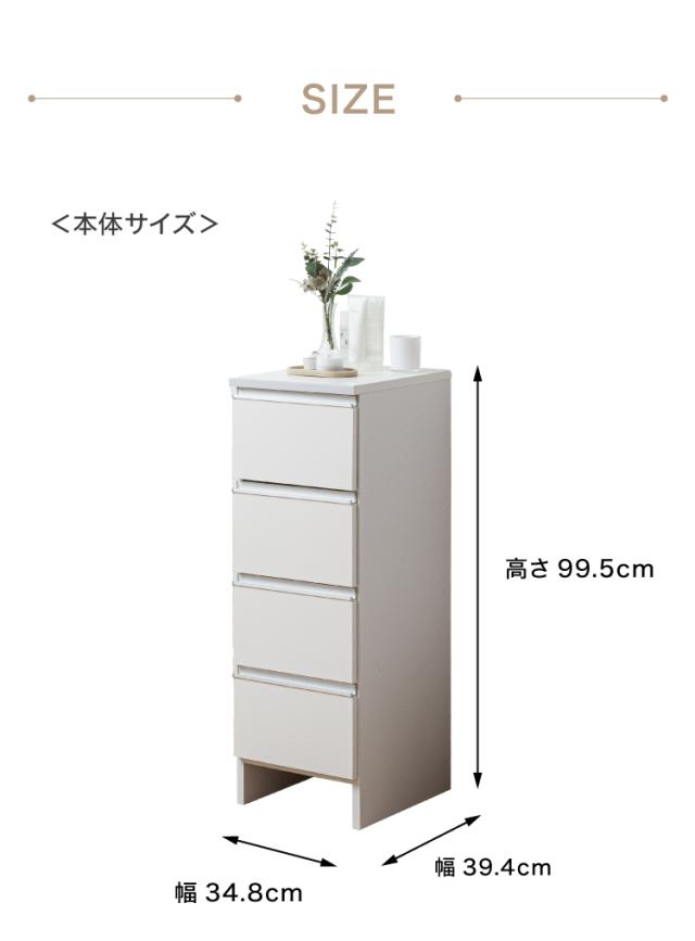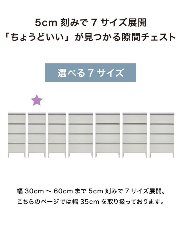 幅35cmの超スリム設計だから、今までデッドスペースになっていた洗面所、脱衣所のすき間、ベッドサイド、リビングのちょっとしたスペースに、驚くほどぴったりフィットします。