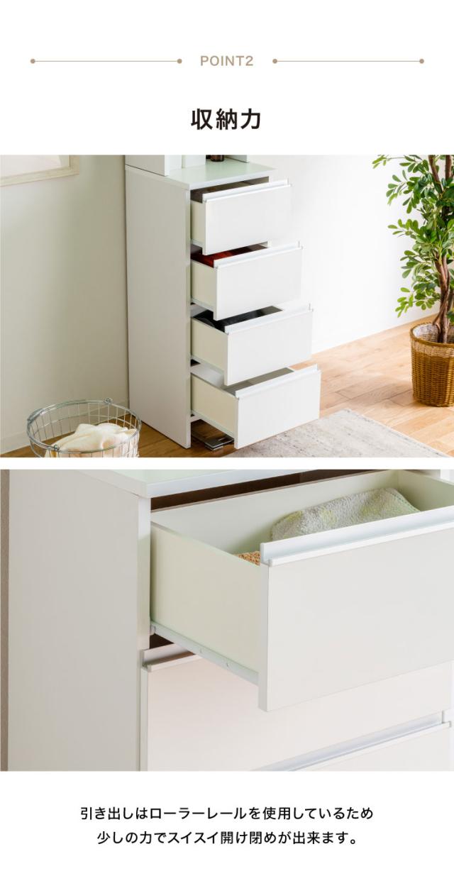 豊富な4段の引き出しで、タオル、衣類、小物などを効率よく収納し、お部屋をスッキリと片付けます。