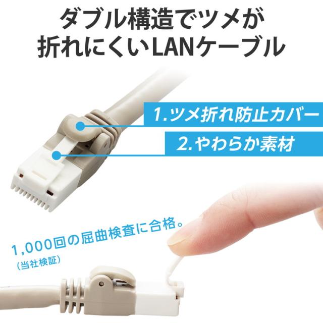 ■ツメ折れ防止プロテクターと屈曲に対する耐久性が高い新素材コネクターを採用したダブル構造で、ツメが折れにくいLANケーブルです。 ※1000回の屈曲検査に合格(当社検証)