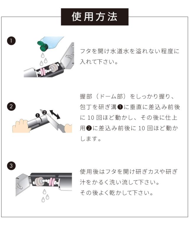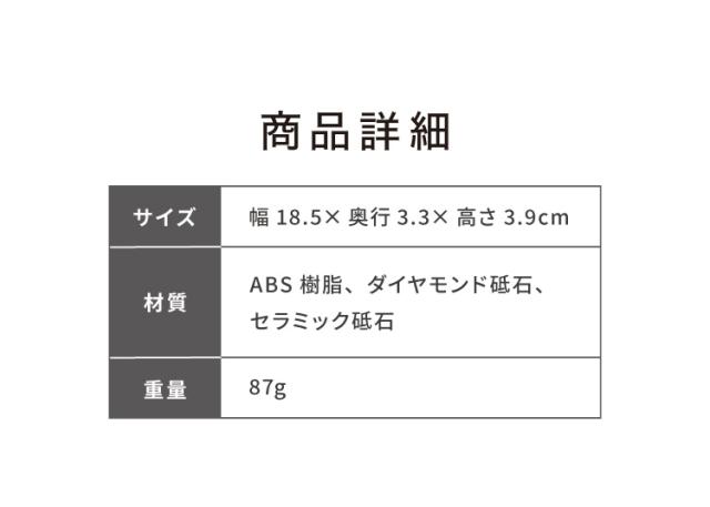 セラミック砥石部で荒研ぎ、ダイヤモンド砥石部で仕上研ぎをする事ができます。各部に包丁を差し込み、前後に10回程動かす事によって、切れ味が蘇ります。※両刃包丁専用