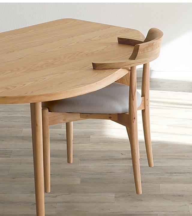 天然木を使用した、ナチュラルテイストのダイニングチェアです。背もたれのカーブが背中にフィットし、かつ背もたれが高いのでゆったり座れます。チェアの肘をテーブルに引っかける事が出来ます。ひっっける事によって脚が浮いて掃除がしやすく、脚の下は10cm空いているので一般的なお掃除ロボットも通ることが可能です。