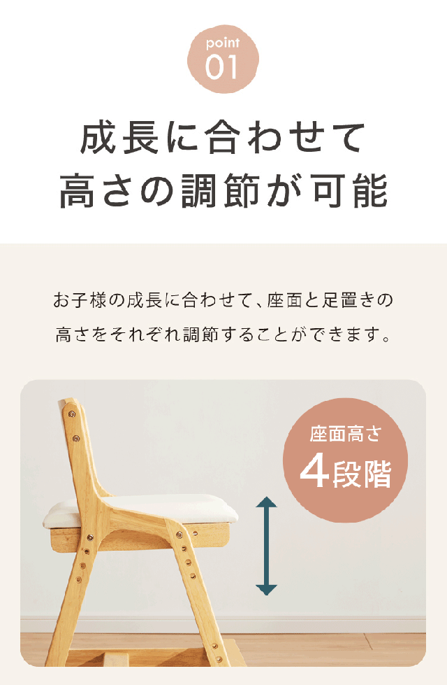 ・成長に合わせて高さが調整できる学習チェアです。