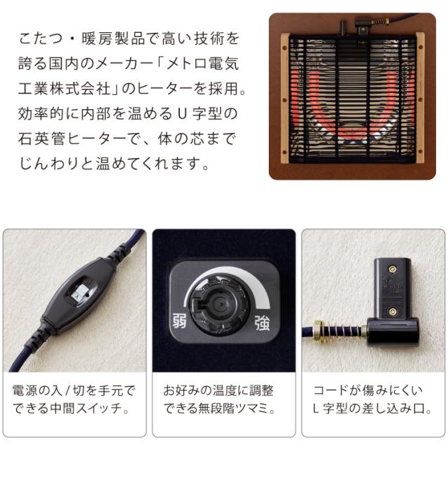こたつ、暖房製品で高い技術を誇るメトロ電気工業株式会社のヒーターを採用。