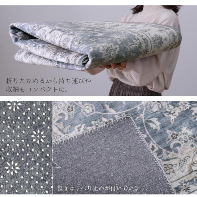 なめらかなフランネル生地に、小さな模様やかすれ感を細部までプリントで表現した、まるで高級ラグのような一枚。短毛でお手入れしやすく、洗濯機で洗えるのでいつも清潔にお使いいただけます。裏面はズレを軽減するすべり止め付き。ホットカーペット・床暖房に対応しており、オールシーズンで使えるラグです。