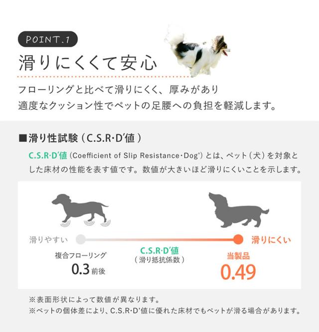 表面のコーティングによりワックスいらずでお手入れ簡単!防滑性・耐久性を備え傷がつきにくく、通常のクッションフロアより厚みがあり適度なクッション性でペットの足腰への負担を軽減します。抗菌・抗ウイルス機能付きで衛生面も安心。約90cm幅のマットサイズで使いやすく、カットもOK。また、複数枚を並べてお部屋に敷き詰めても◎