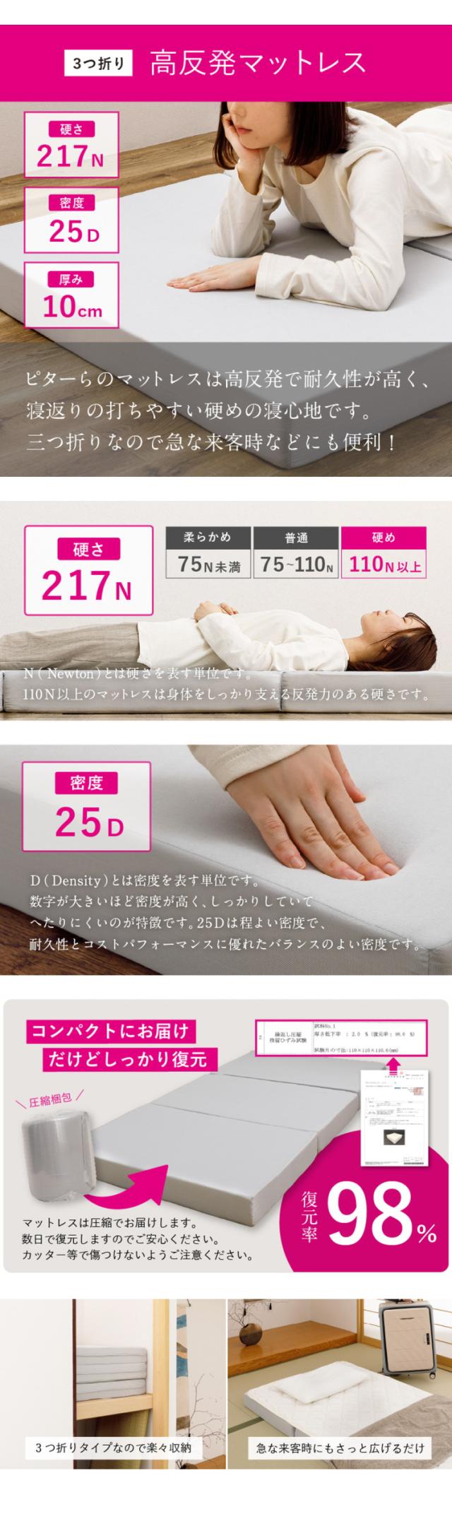 ピターらのマットレスは高反発で耐久性が高く、寝返りの打ちやすい硬めの寝心地です。