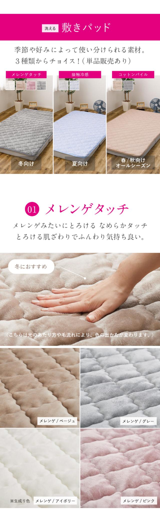敷きパッドは「メレンゲタッチ」「接触冷感」「(コットン)パイル」の3種類の生地タイプからお選びいただけます。