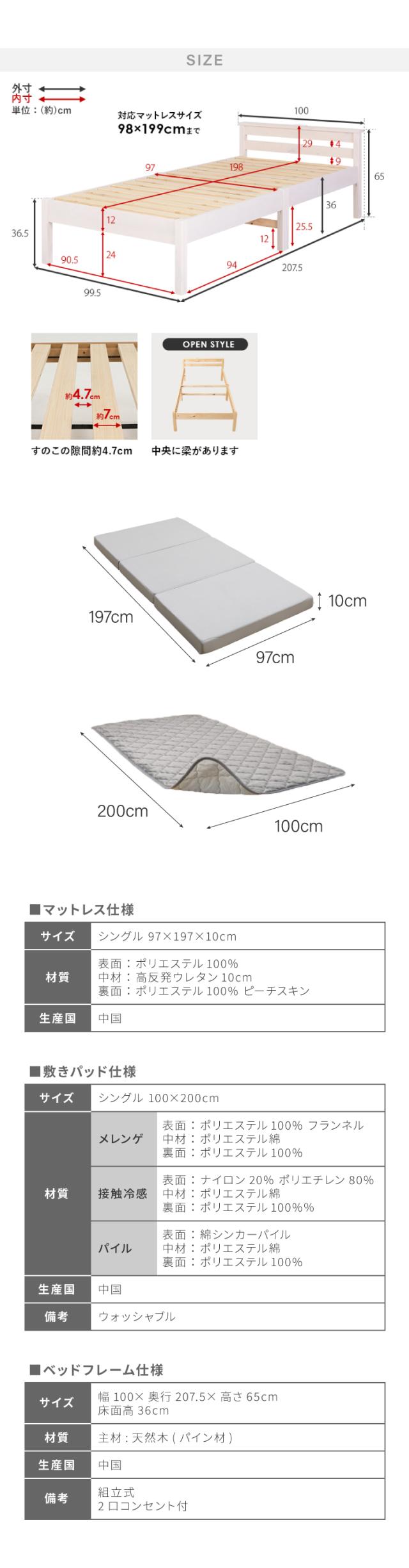 専用マットレス・専用敷きパッド・棚付きベッドフレーム 3点セット