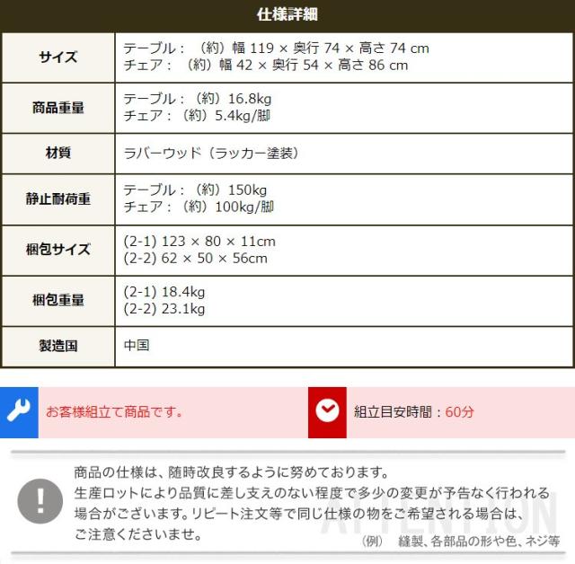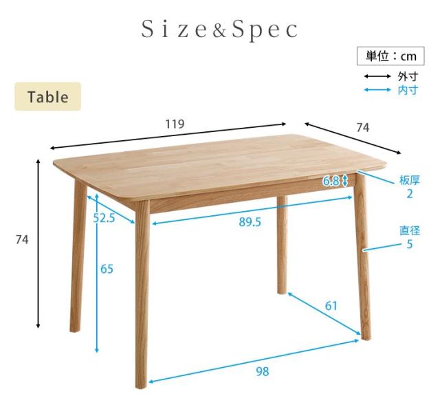 テーブル:幅119x奥行き74x高さ74cm