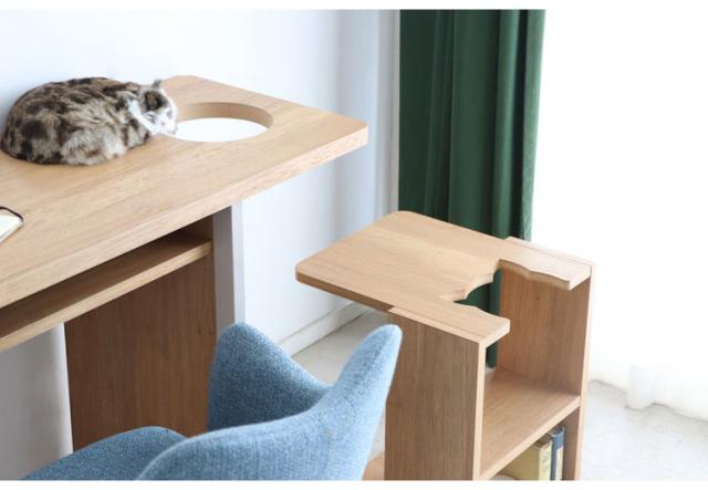 猫がサイドテーブルを踏み台にデスクに登れる、猫のための家具セットです。