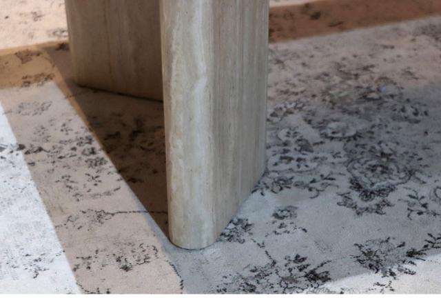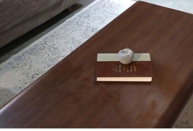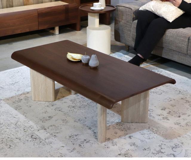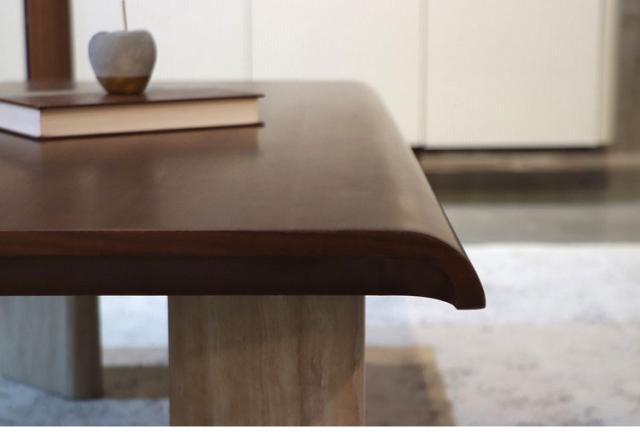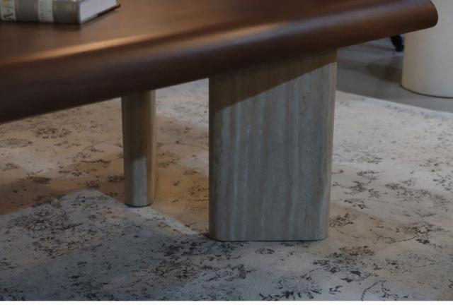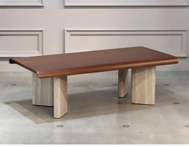 温かみのあるウッドの天板を、美しいマーブル模様の脚が支えるユニークなデザイン。