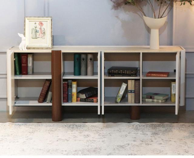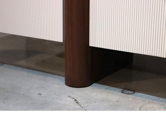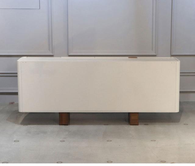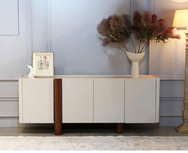 縦のラインが美しい白い扉と、温かみのある木製脚のコントラストが目を引くサイドボード。