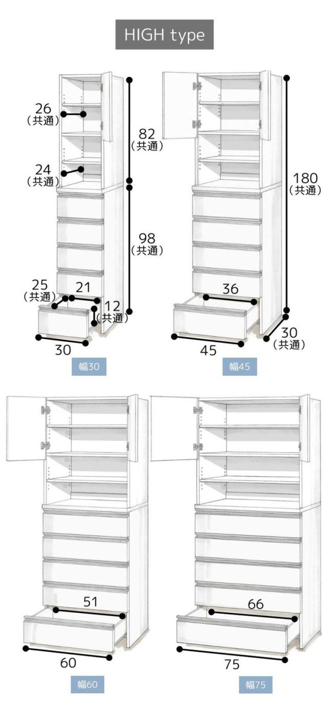 幅30cm×高さ180cm | 幅45cm×高さ180cm | 幅60cm×高さ180cm | 幅75cm×高さ180cm |