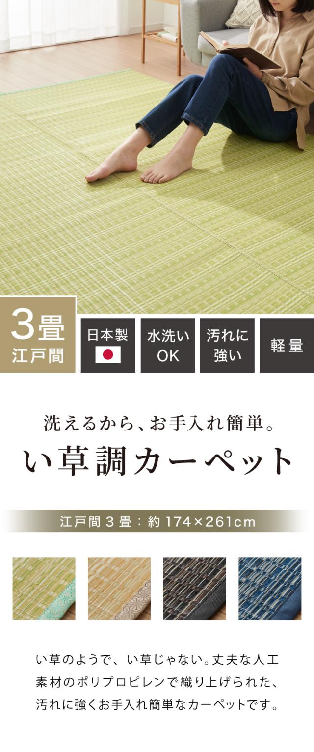 洗える い草調 カーペット ダイニング ラグ 江戸間3畳(約174×261cm) 長方形 敷詰 上敷き 丈夫 日本製 国産 除菌スプレー対応 ござ アウトドア ペット 犬 猫(代引不可)【送料無料】