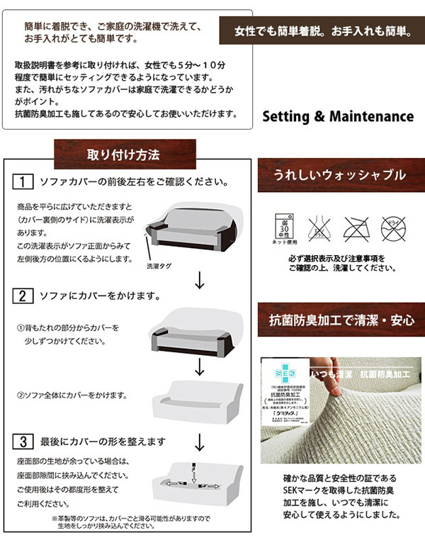 ポリエステル素材がほとんどの従来人のソファカバーに対して、コットン比率を大幅にアップすることで抜群の肌触りと吸湿性を実現しました。またいつでも快適にご愛用していただけるようにも施してあります。