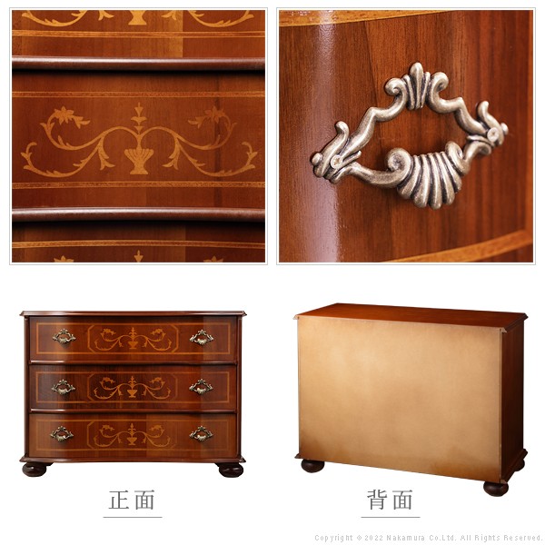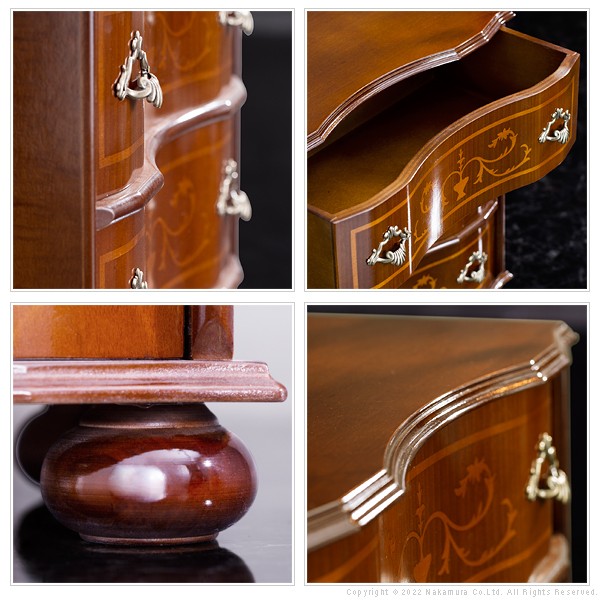 象嵌細工や彫刻、やわらかな曲線を描く前板や猫脚など、イタリア伝統の技とスタイルをご堪能頂けます。